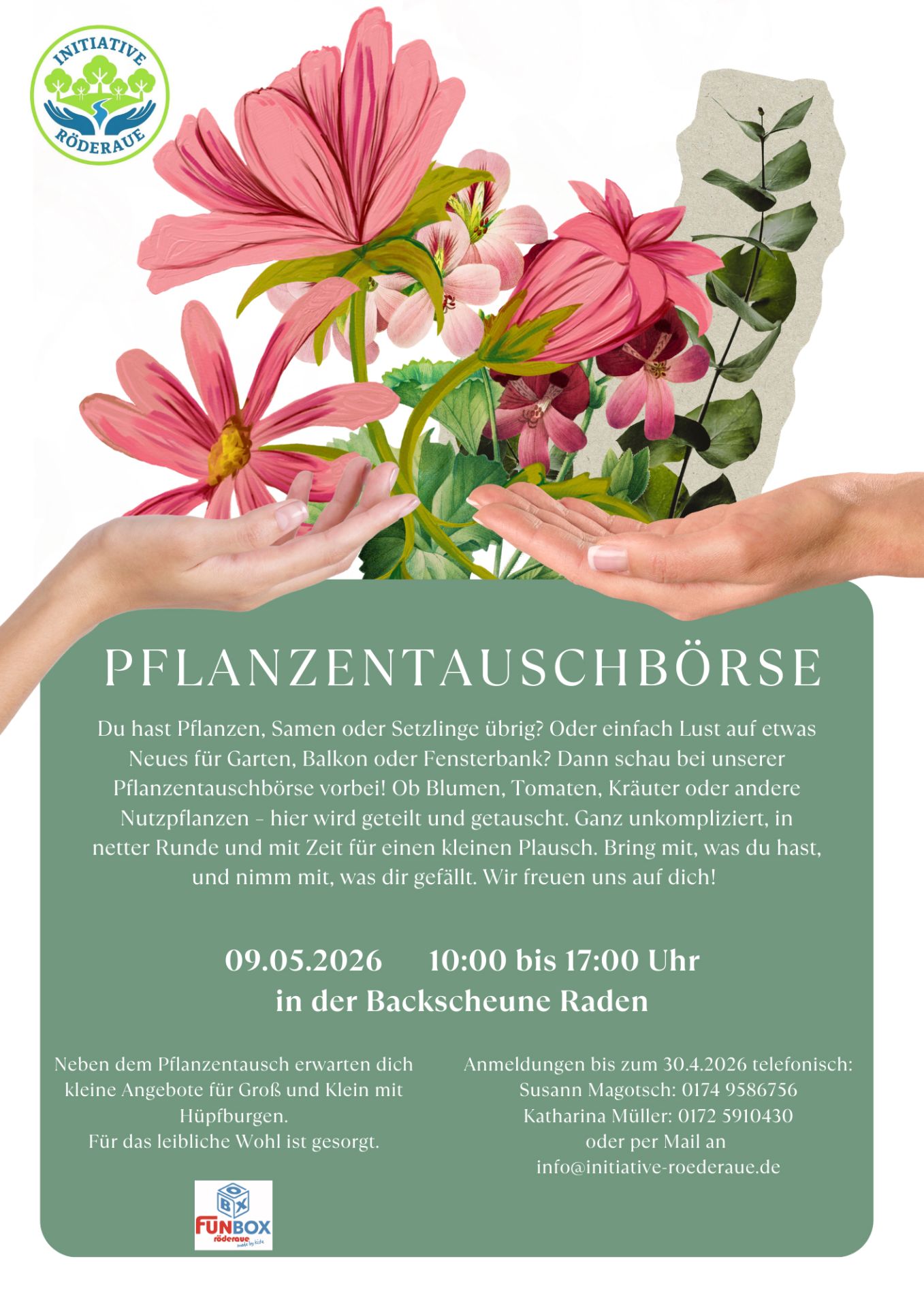 Wir, die Initiative Röderaue, laden euch herzlich zu einer Pflanzentauschbörse am 9. Mai 2026 in der Backscheune Raden ein.